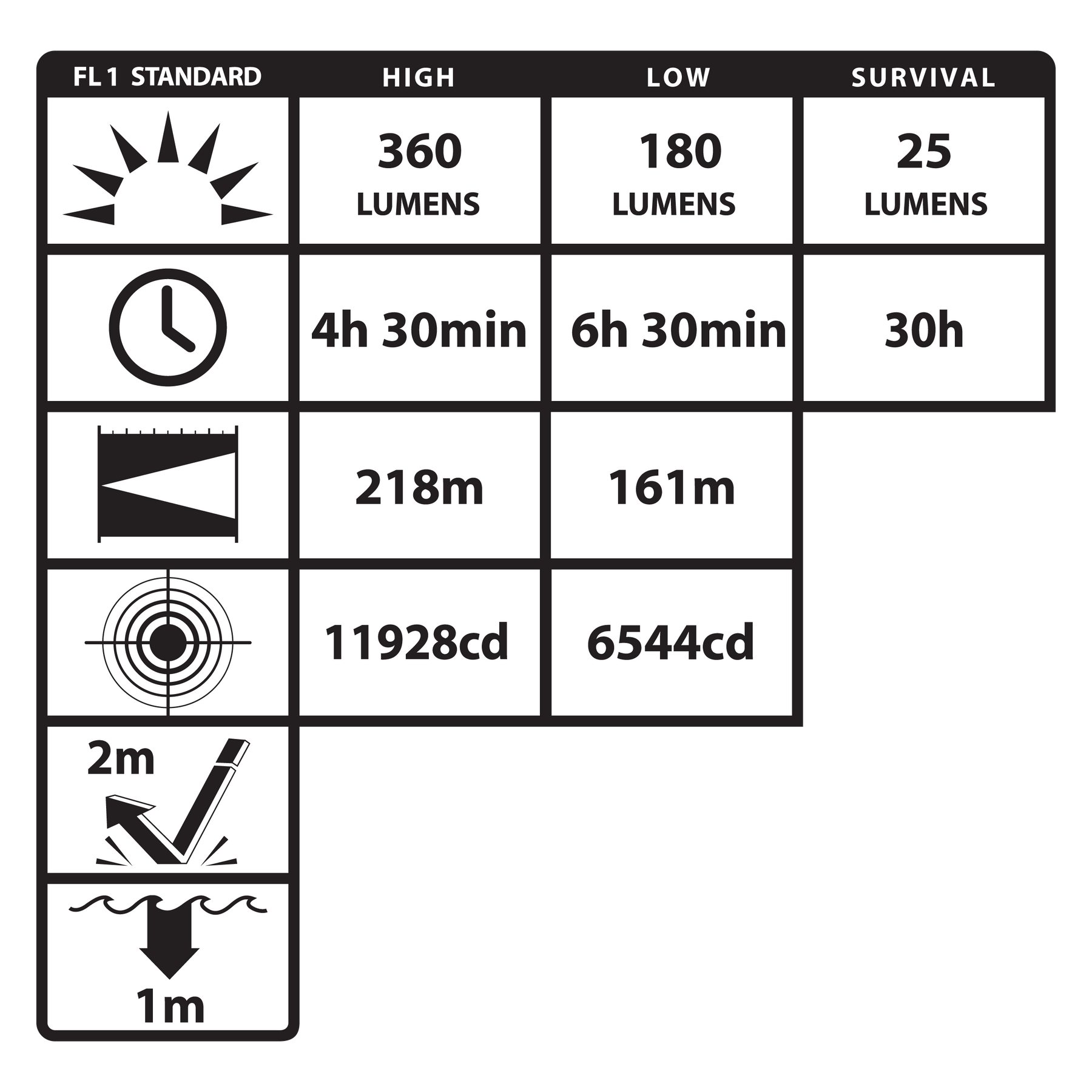 • User-selectable 360-lumen High, 180-lumen Low and 25-lumen Survival modes