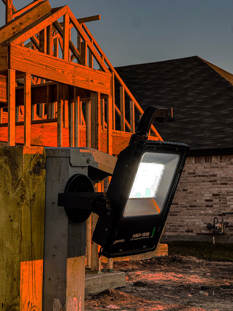 The NSR-1518 rechargeable LED scene light packs a juggernaut of brightness with 12,500 lumens on high and 6,250 on low. Recharging fully in 4 hours, it's designed for the pro who needs fast, powerful, and portable lighting, featuring a cast aluminum housing with a heat-dissipating multi-fin design to stay cool under pressure. The 360-degree swivel handle makes it easy to carry or hook onto doors, ladders, or tree limbs, and the light pivots forward and backward for precise positioning.