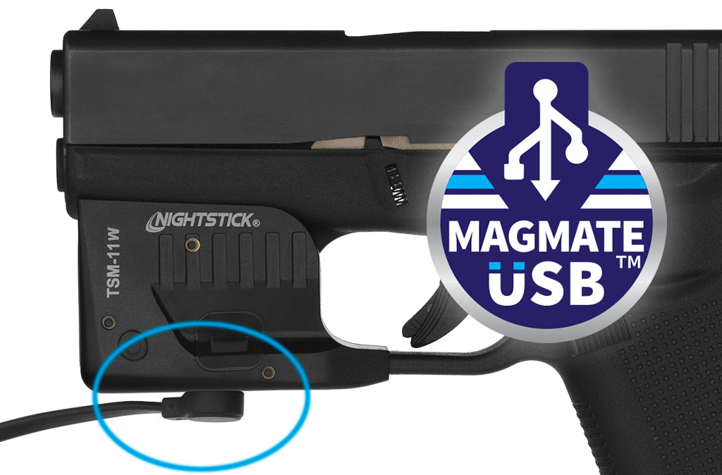 All eight TSM-Series subcompact weapon lights feature our integrated li-ion battery and easy MagMate™ on-board USB recharging. The charger head snaps into place with a positive click. The USB type-A end plugs into any USB port, or wall adapter and shows charge status (red while charging / green when fully charged).